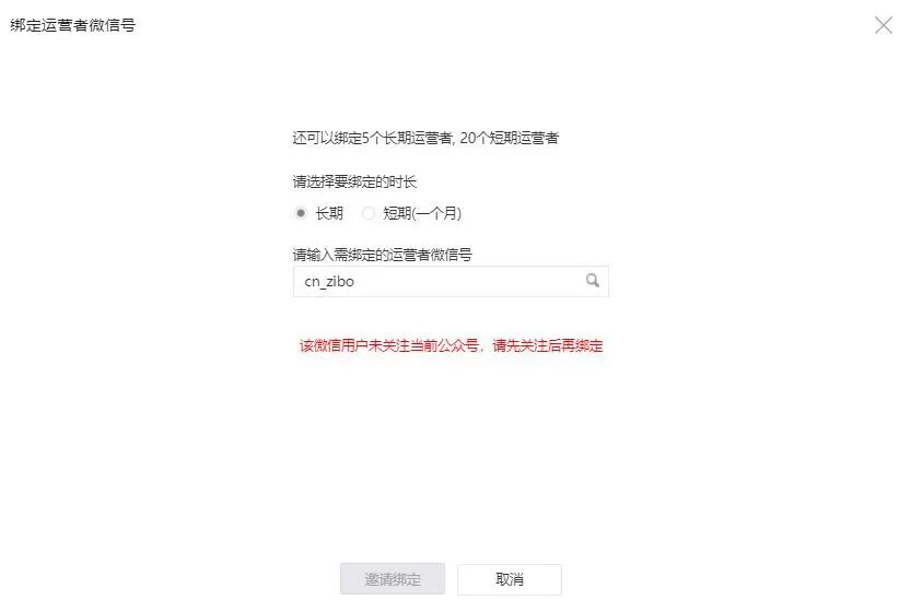 请进入公众平台->设置->人员设置->运营者管理->绑定运营者微信号->选择长期/短期->给运营者微信号下发邀请->同意邀请。
