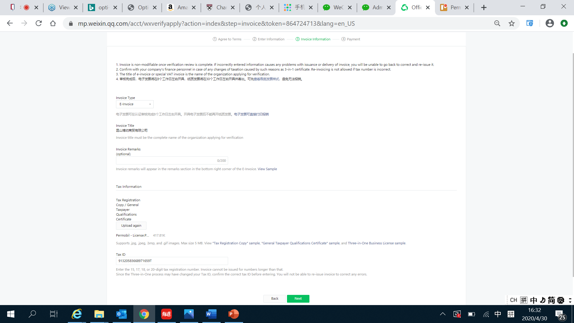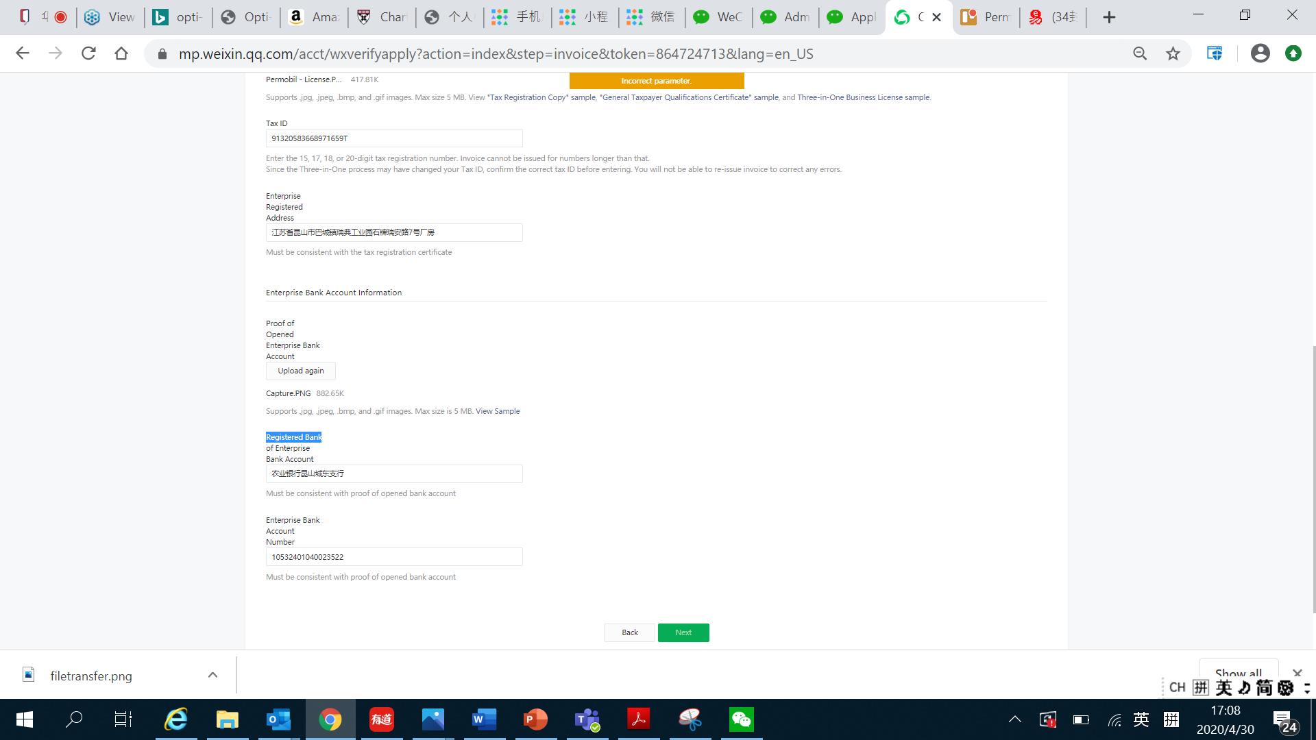 在填developer qualification的第三步invoice information的时候,出现incorrect parameter,不能到下一步