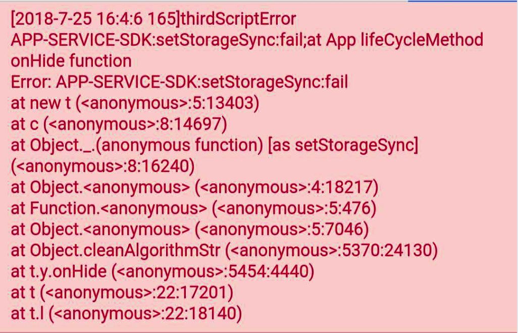 截图里的报错看起来只是存储storage时fail了。并不是什么js的语法错误,但是报错信息里为什么会有“thirdScriptError”。我们的代码里有根据这个关键字用来收集报错信息,手机上来的报错全都是正常的情况