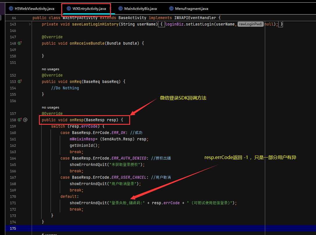 异常的账号登录报错后。让用户更换到可以正常进行微信登录的手机操作登录,仍然报错10060。报错的代码截图请参考