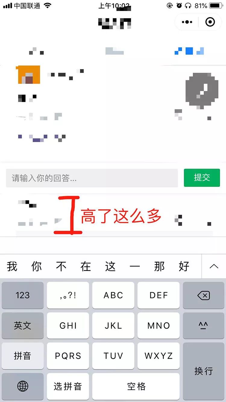 是红米的某个机型的问题,可以通过wx:getSyxtemInfo({})获取到该机型,然后给定一个定值(该定值为你后来获取的软键盘的高度)