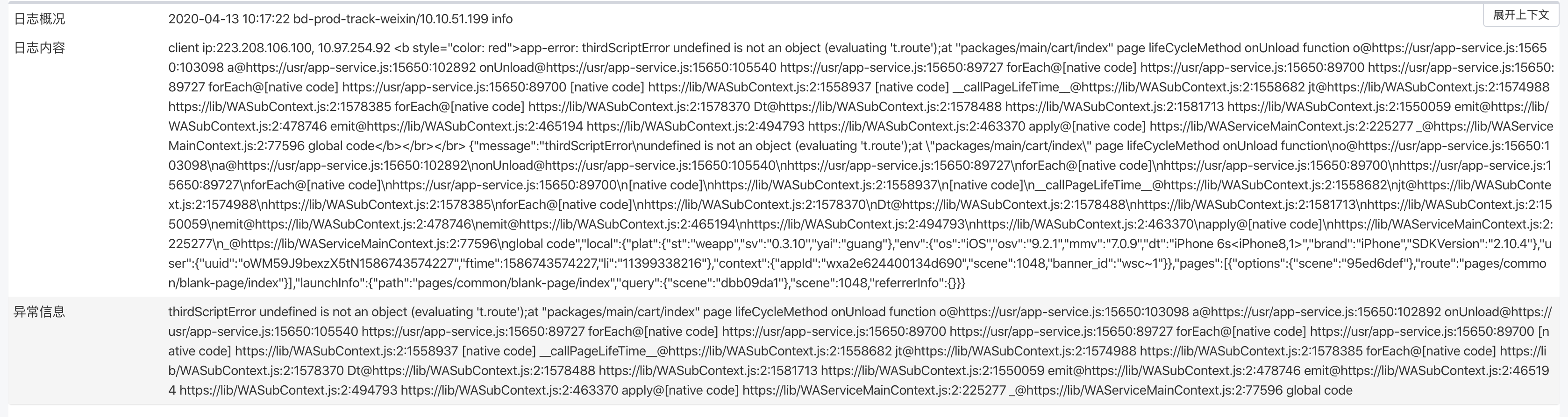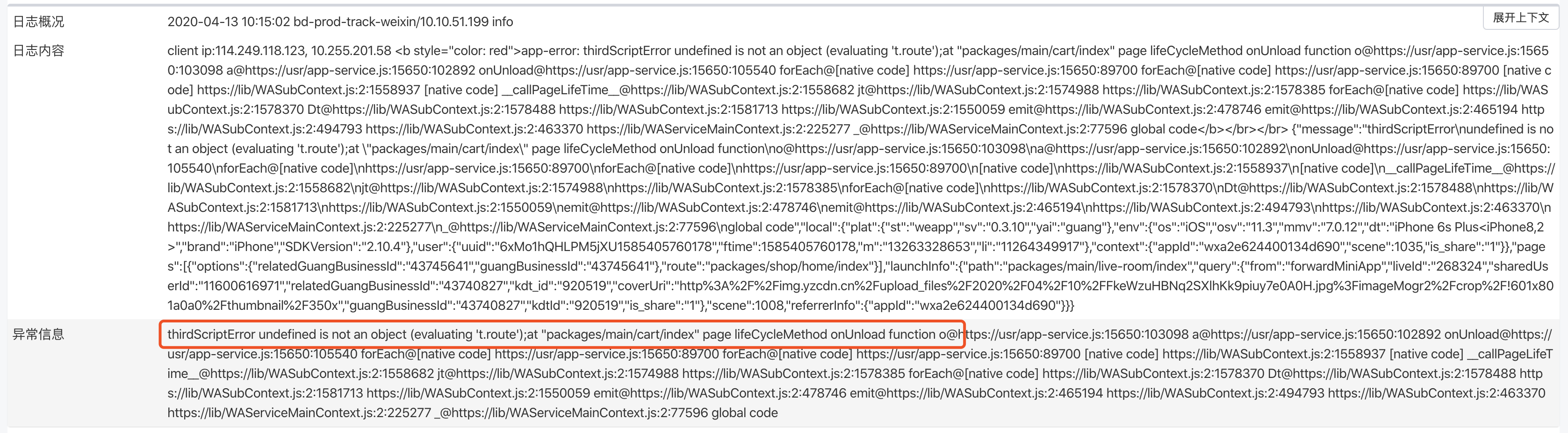 线上日志最近出现很多这个报错,本地无法复现,在packages/main/cart/index这个页面我也没有使用route这个字段,请问是什么情况会出现这个报错啊?