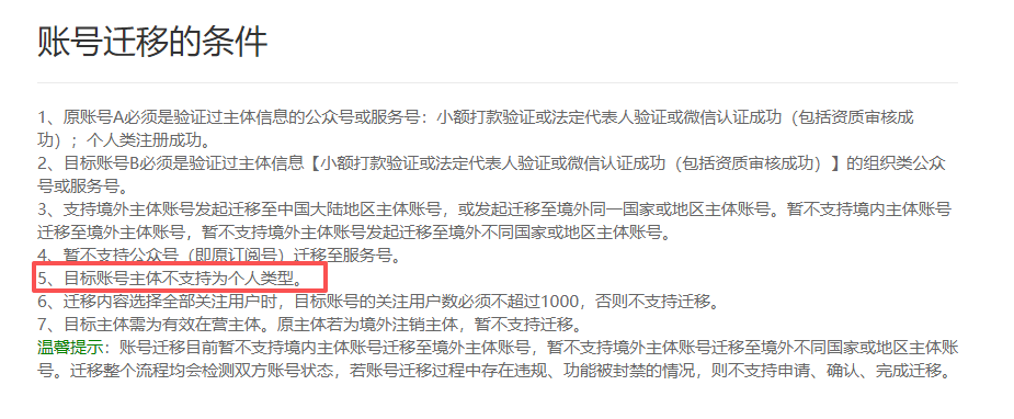 公众号不支持迁移成为个人主体,支持非个人主体。