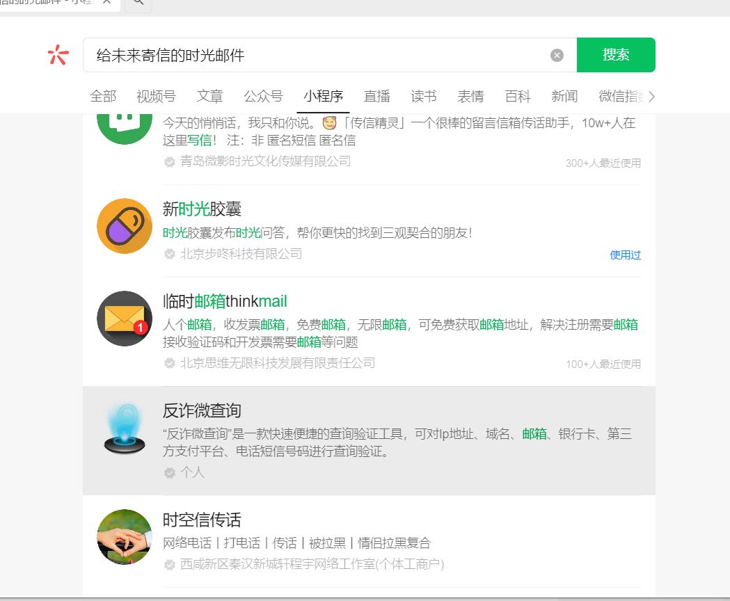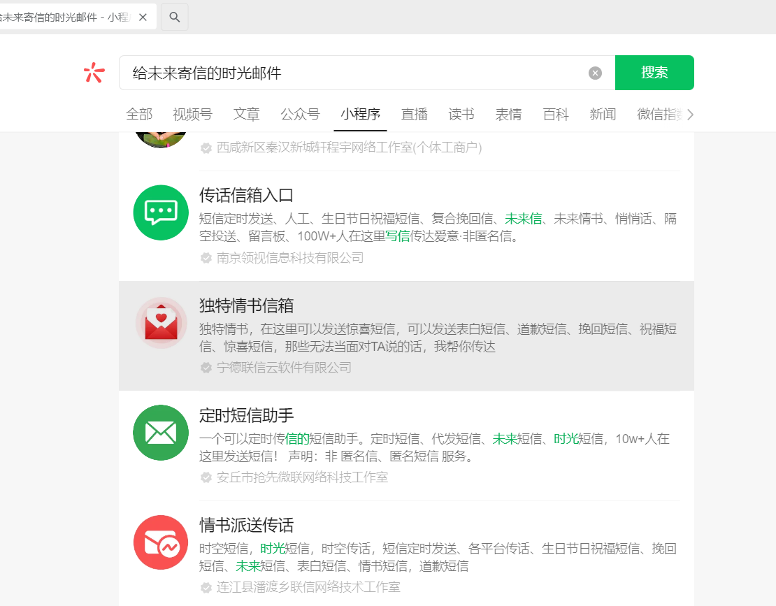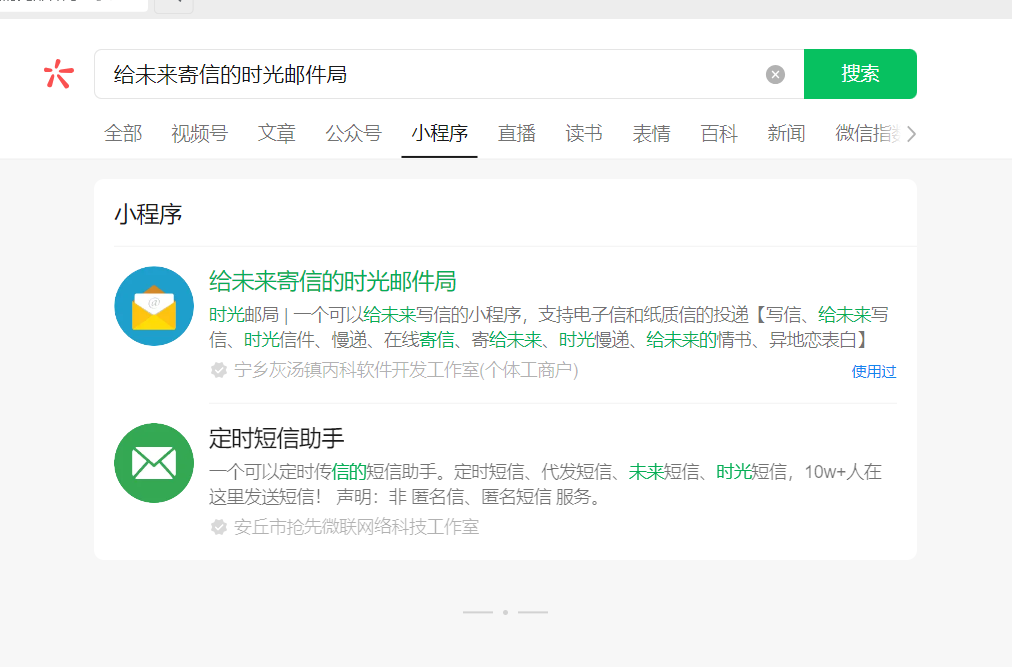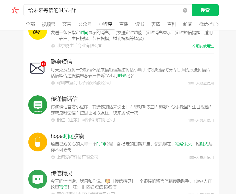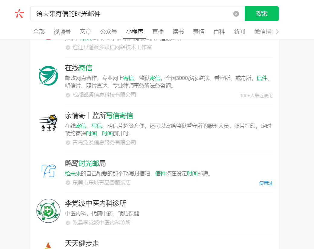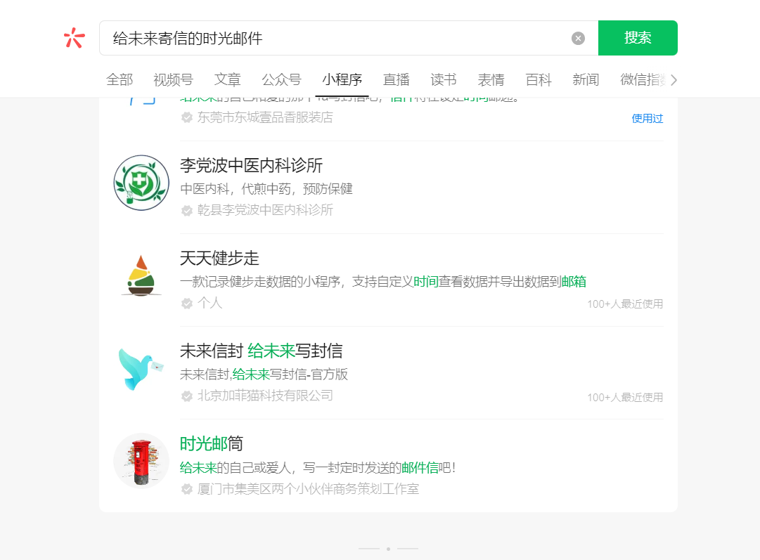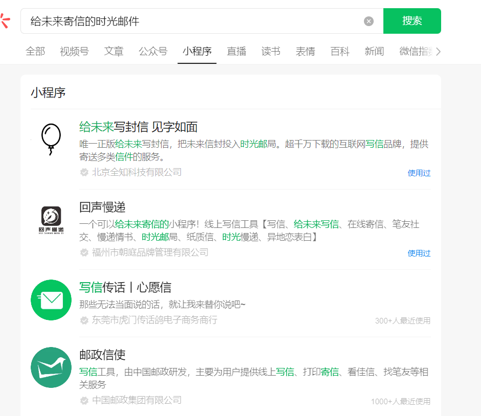 通过微信搜索小程序,输入“给未来寄信的时光邮件”,搜索不到“给未来寄信的时光邮件局”的小程序,必须输入全称才能搜索到,如下图。