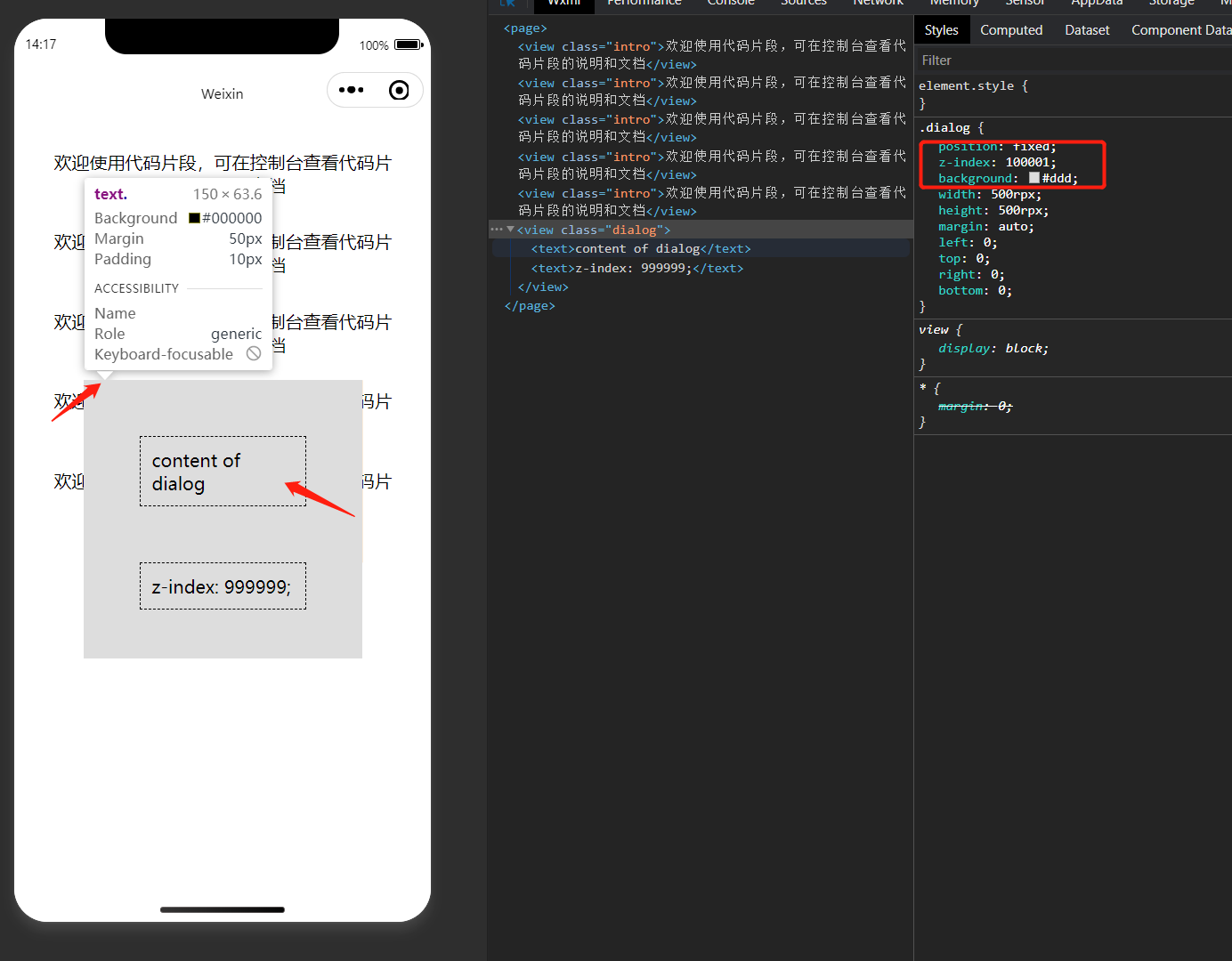 当元素设置z-index值大于100000时,开发工具的wxml节点拾取工具会出现异常,无法正常选中元素,如图所示