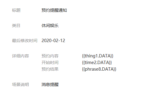 data的参数赋值为: "{\"thing1\":{\"value\":\"用户在125489\"},\"time2\":{\"value\":\"2020年2月26日 12:12\"},\"phrase8\":{\"value\":\"待回复\"}}";