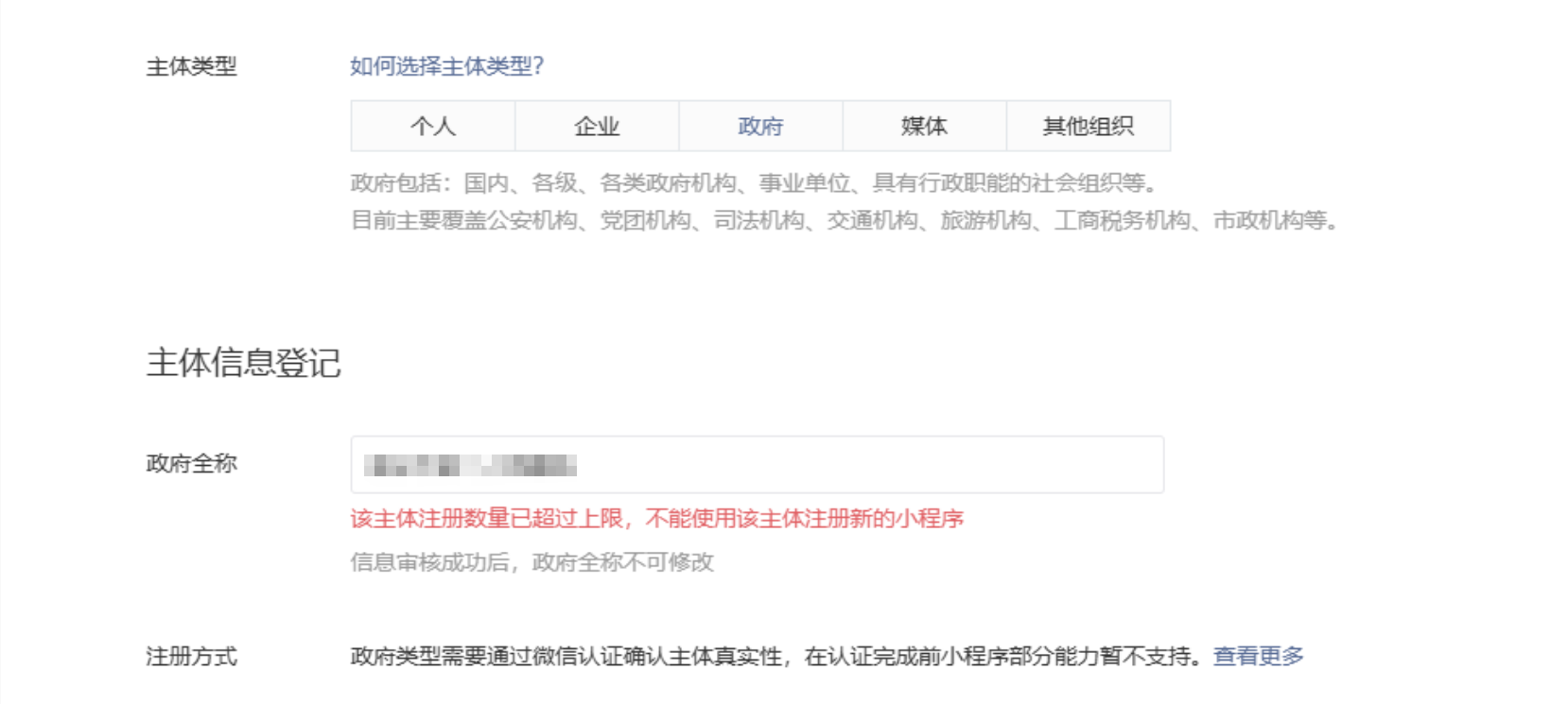 我是XXX事业机构,我在注册以小程序时,提示我“该主体注册数量已超过上限,不能使用该主体注册新的小程序”。
