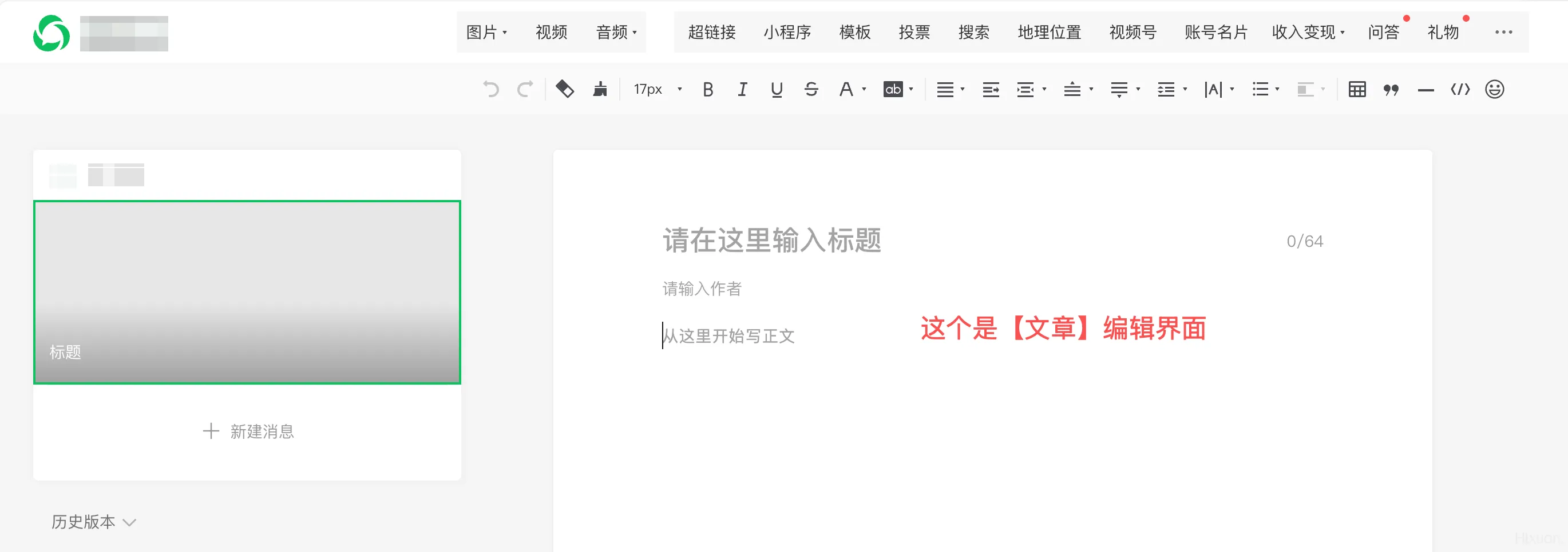 你当前选择的是【图文】(即原“图片/文字”消息)类型,并不是【文章】类型哦。