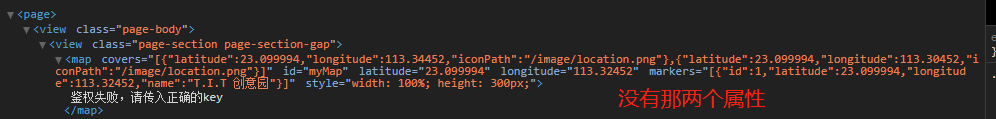 明明在代码里写了ploygon和show-location,在控制台里看代码却找不到这两个属性。而且还显示鉴权失败,请传入正确的key。
