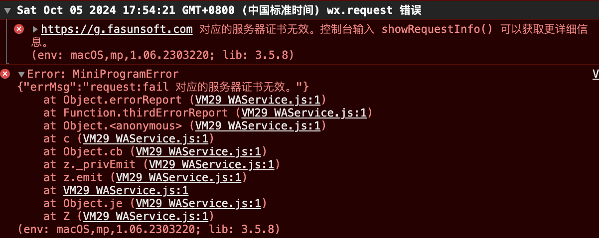 域名证书续签之后出现这个报错,https://g.fasunsoft.com 可以正常使用,在postman中测试接口调用都是好了。怎么小程序开发就报错。试过本地补验证域名,但是正式部署的小程序不能用,获取不到数据。着急,帮忙看看是怎么回事。谢谢