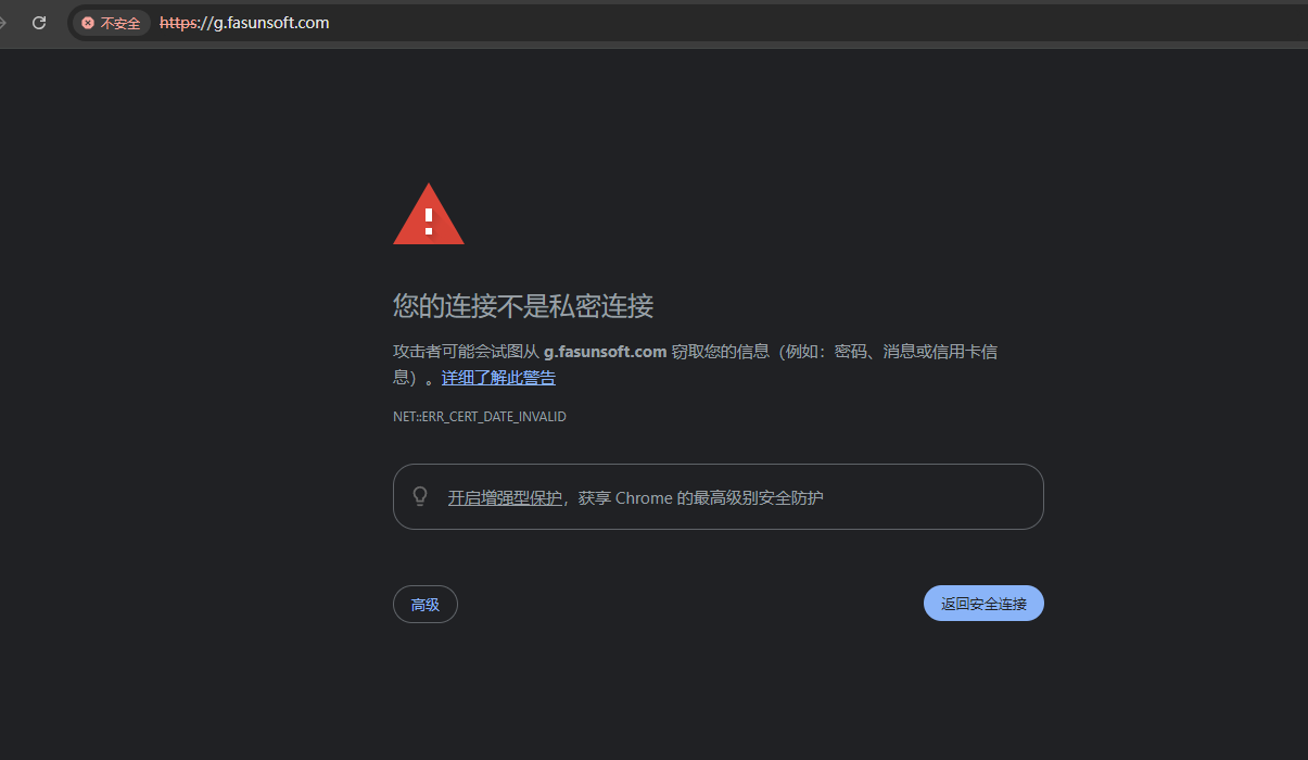 用浏览器访问你的域名,浏览器提示证书已在9月11日过期,建议配置好新的证书再尝试