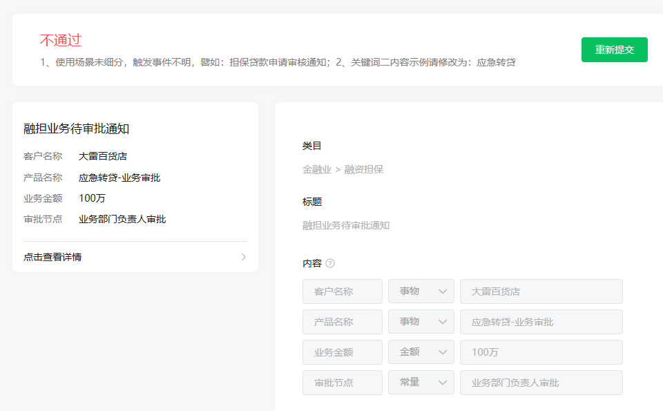 1、使用场景未细分,触发事件不明,譬如:担保贷款申请审核通知;