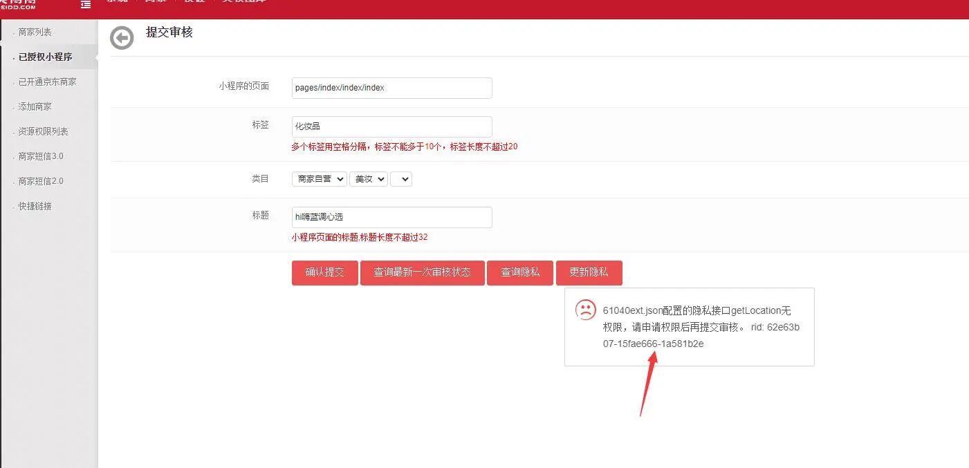 ext.json配置的隐私接口getLocation无权限,请申请权限后再提交审核。 rid: 62e63b07-15fae666-1a581b2e