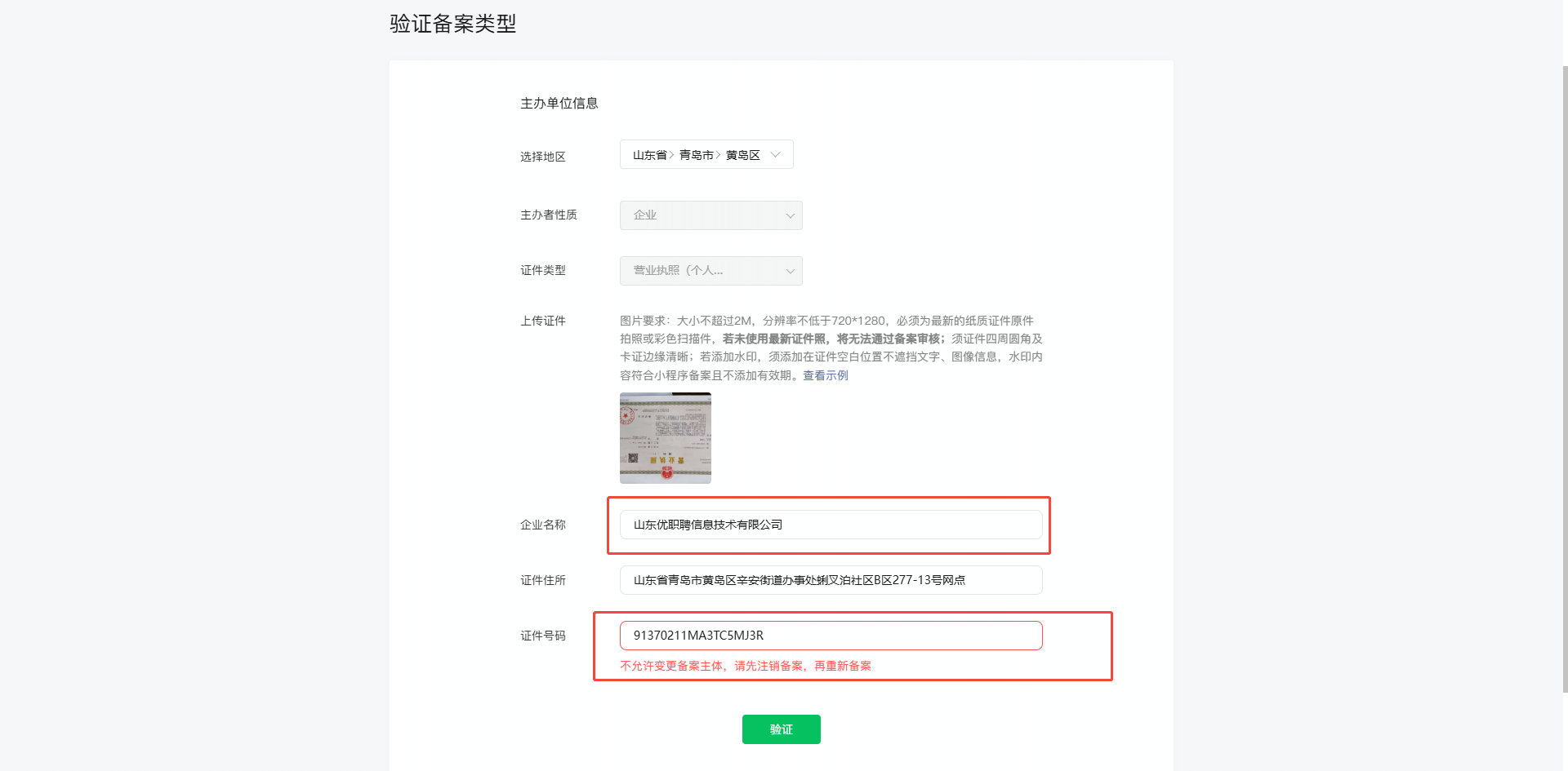 二.上传营业执照验证备案信息(提示不允许变更备案主体,请先注销备案,再重新备案)上传营业执照企业名称与基本信息中一致。