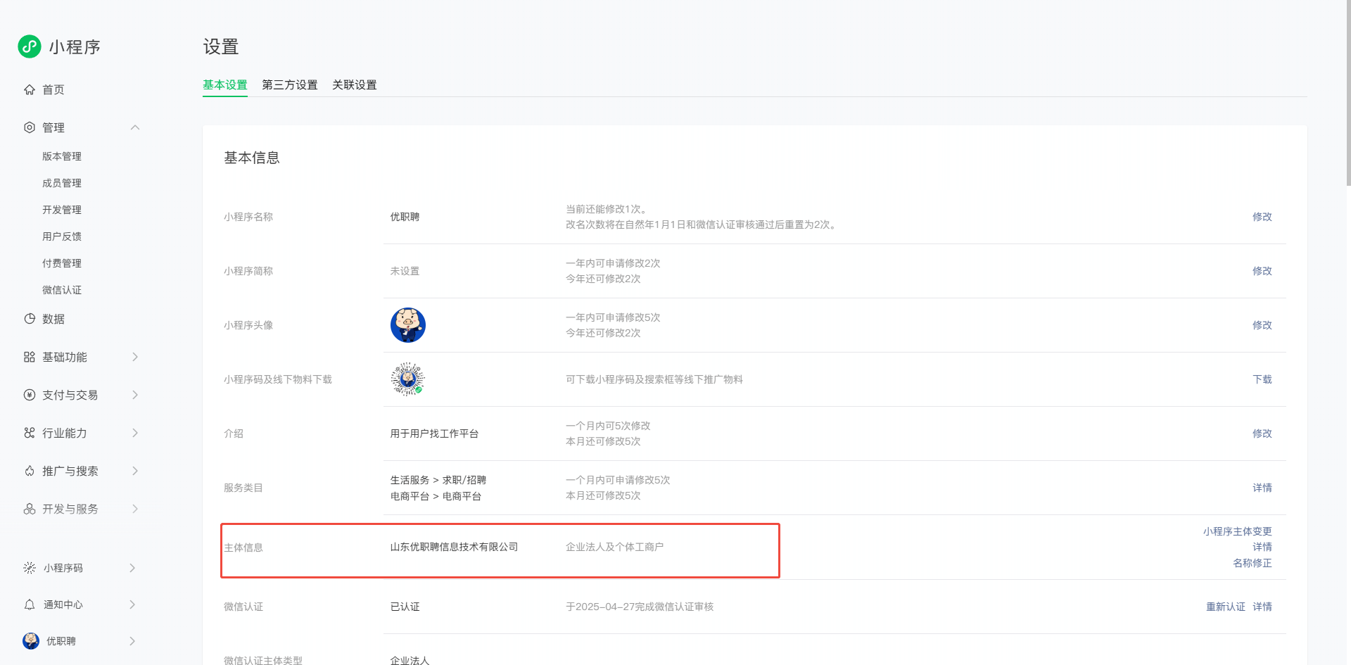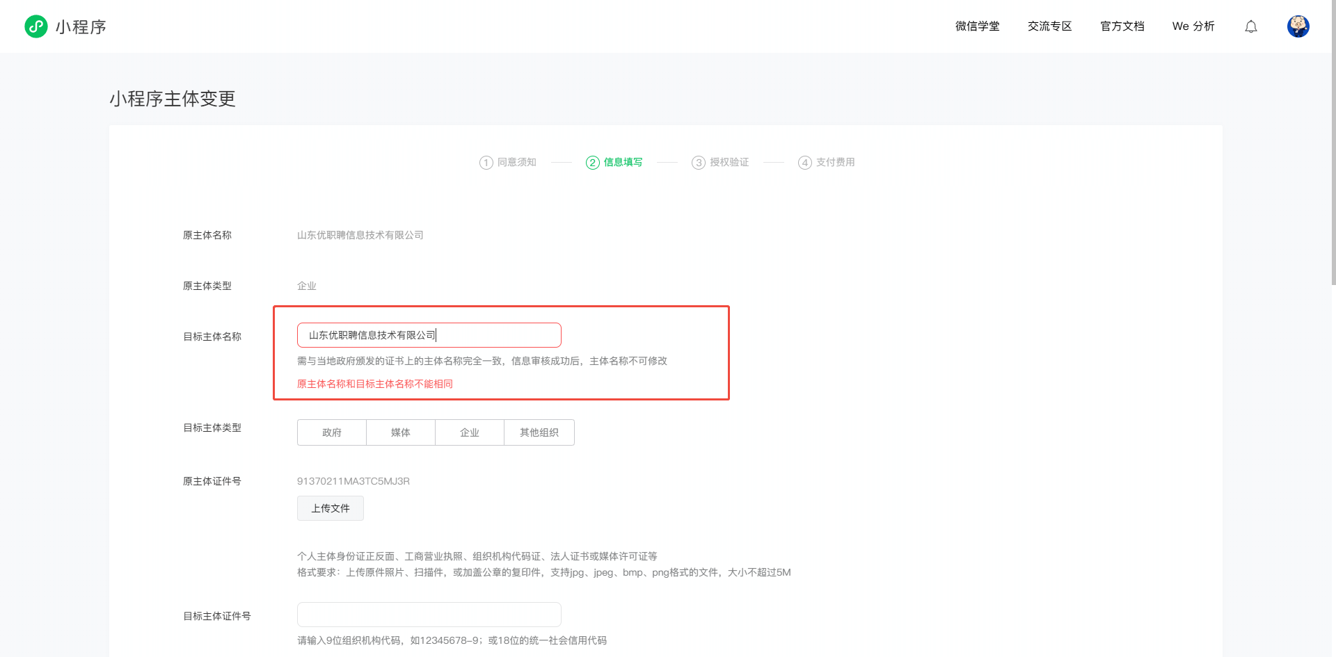 三.由第二步提示后尝试【小程序主体变更申请】提示:原主体名称和目标主体名称不能相同