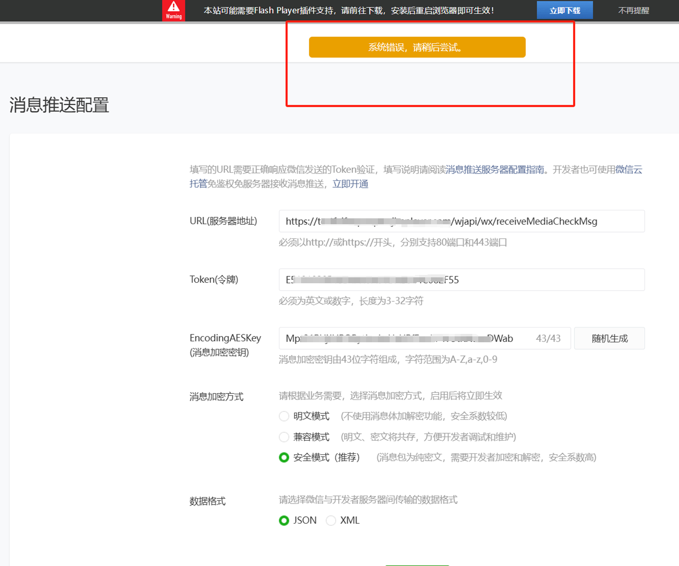 小程序-开发管理-消息推送启用添加配置信息后都是提示系统失败
