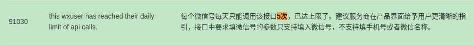 而我是{"errcode":91030,"errmsg":"reach wxid freq limit. rid: 68358be5-063019fd-6b99fe3b"},是否文档需要完善下