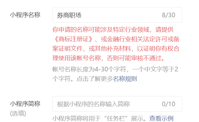再次解释下,我们是做证券行业的资讯汇总平台,只提供信息整合和大家求职过程中的解惑指导,不涉及任何金融交易和证券交易。公众号是证券招聘网,已经认证通过了,为什么小程序怎么起名字都不行?是不是所有和证券相关和相近的名字都必须变成提供金融许可证?