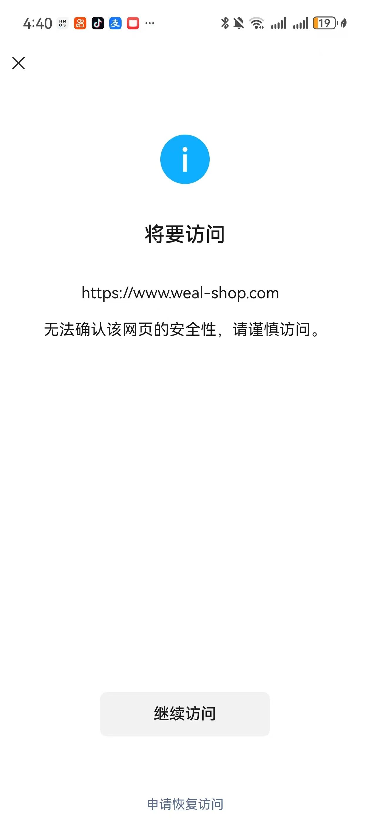 我在公众号中访问的我的商城. https://weal-shop.com 为啥一直提示无法确认网页安全性, 都备案过了.