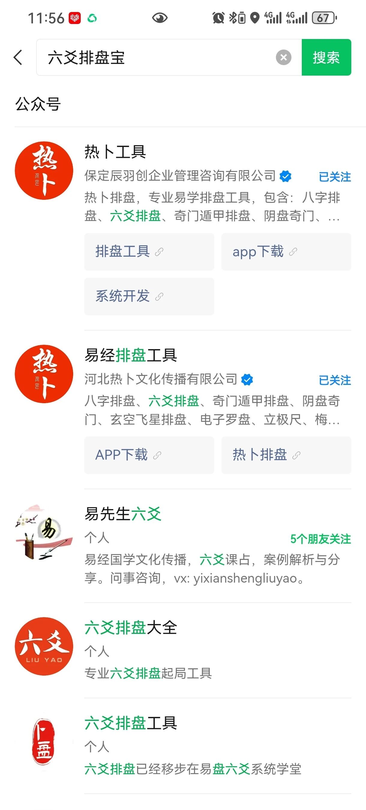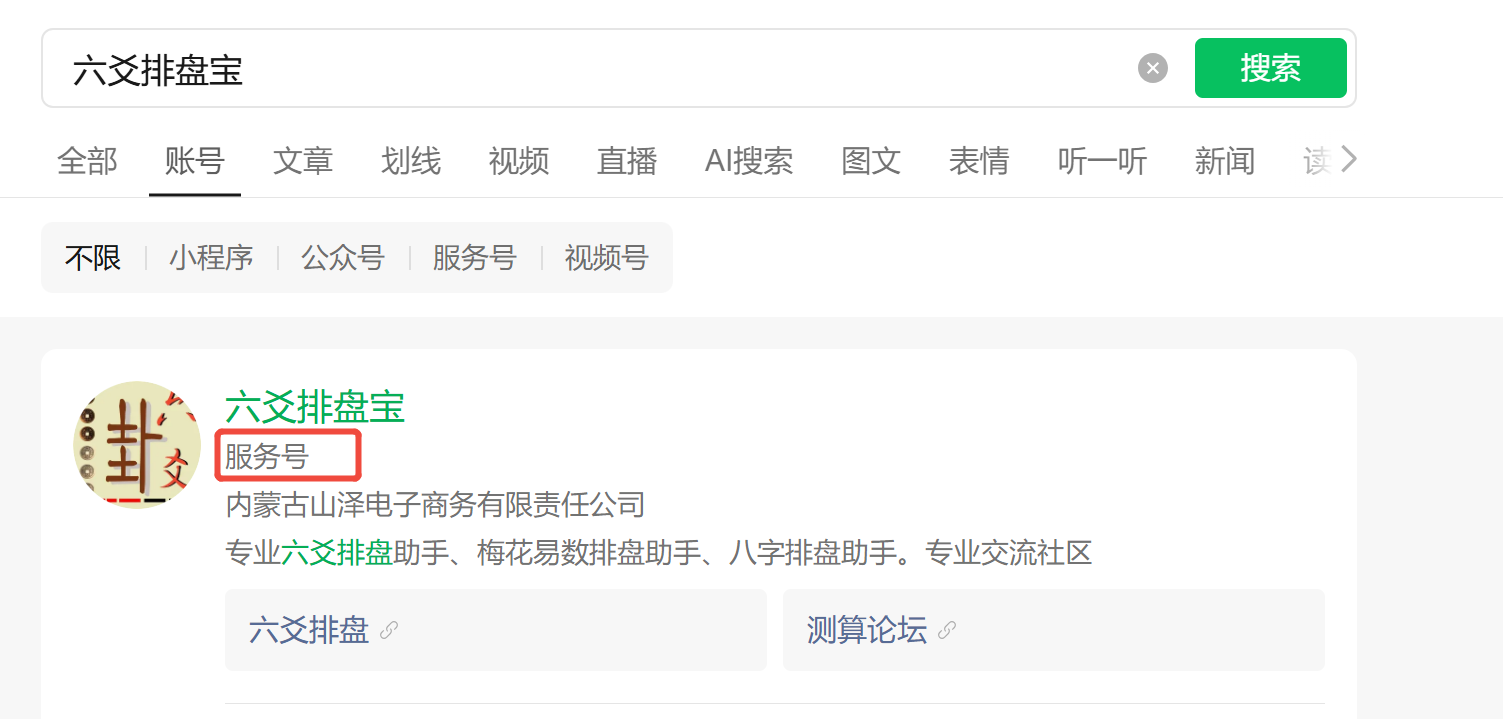 我设置已经允许被搜索了。 公众号名称:六爻排盘宝 Id:wx39103f42920143df 搜索:六爻排盘宝 查不到