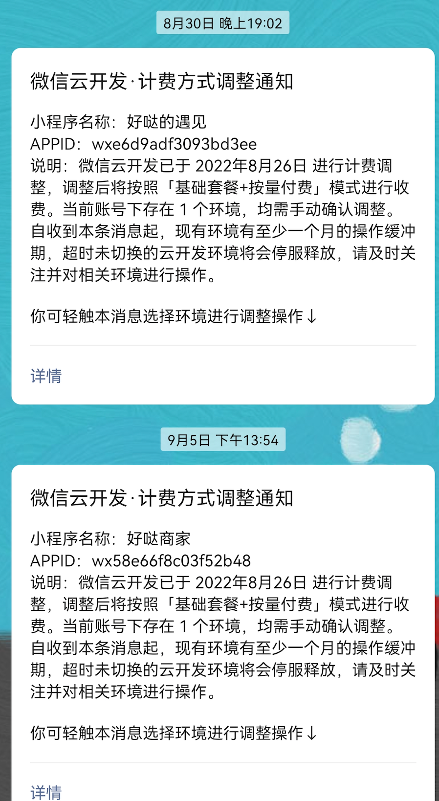 现象:并没有使用微信云开发功能,连续收到多次微信公众平台的推送消息【微信云开发·计费方式调整通知】。