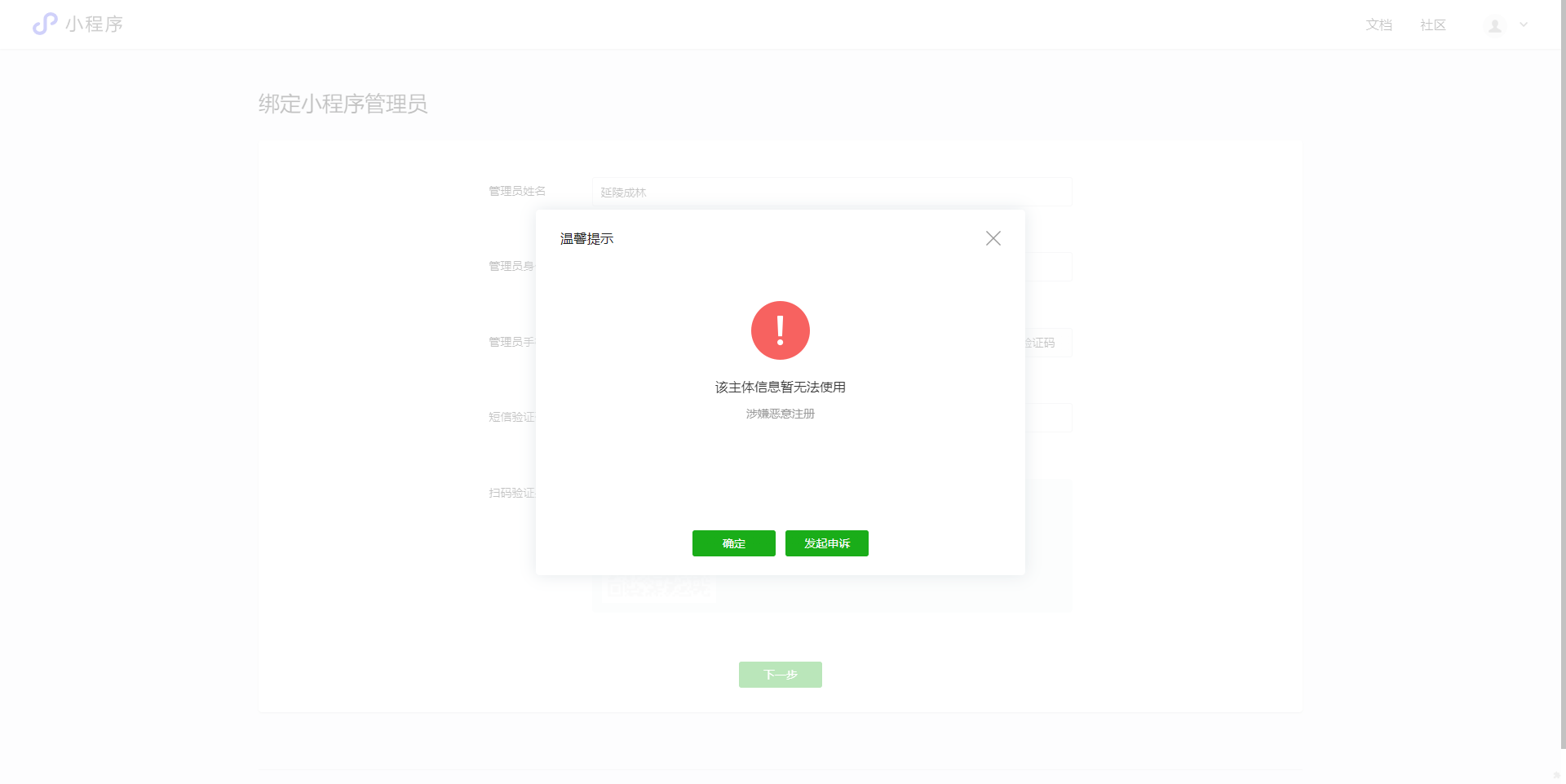 小程序账号也无法注册。一提交就提示
