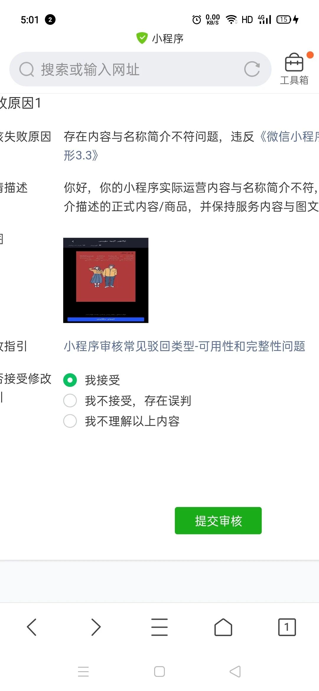 你好,你的小程序实际运营内容与名称简介不符,请上架符合小程序名称简介描述的正式内容/商品,并保持服务内容与图文一致 什么回事?两次发布未通过