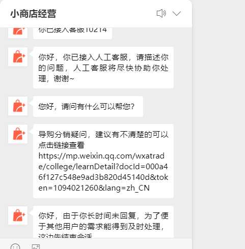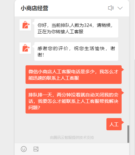 微信小商店人工客服到底有几个人,为什么从早上到晚上一直处于排队状态,排队状态不会更新预计还有多久的吗?早上一早起来排队人工服务,到上午十点多两分钟没看消息自动给我关闭会话了,我回你了吗,你就给我关掉会话?为什么持续发送人工服务关键词不会多次提醒具体前面还有多少人在排队,还不能每天六点就没人了,周末还双休,到底能不能服务,做不好就不要做了,放开业务给其他人去做不行吗?外包一个客服团队也行啊,就算不能完美解决商户问题,最起码你得有个人在线能聊一下,商户的心里也会舒服一点吧,整天干等着人工回复,一个月能跟人工说上几句话就是撞大运了