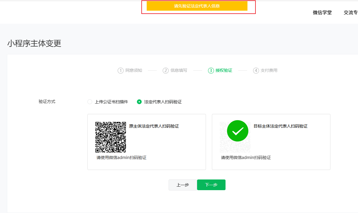 小程序主体变更法人扫码后提示:请先验证法定代表人信息