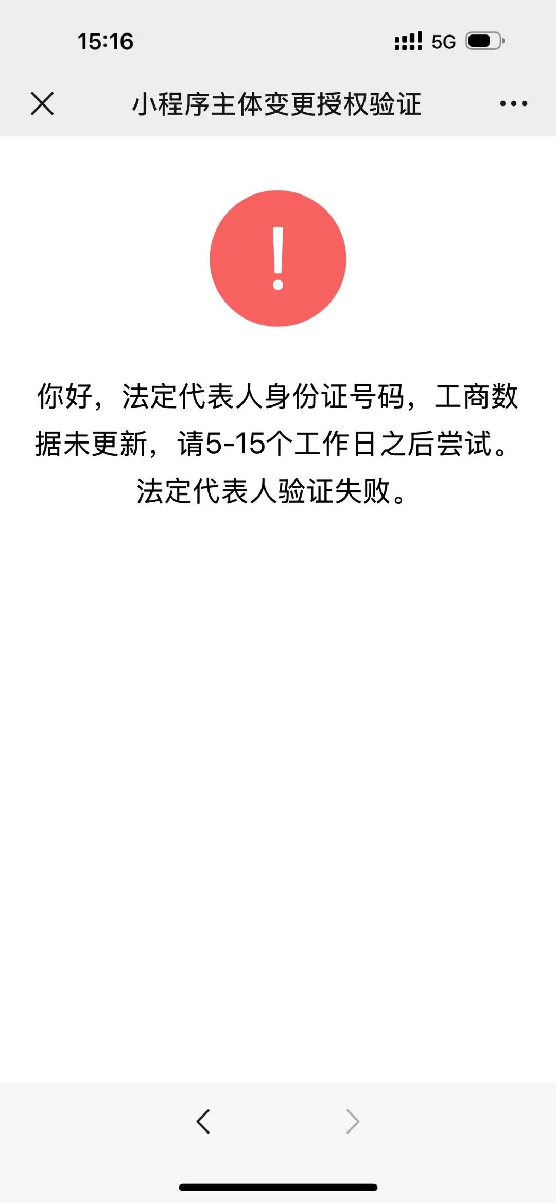 微信小程序主体变更报错,你好,法定代表人身份证号码,工商数据未更新,请5-15个工作日之后尝试。法定