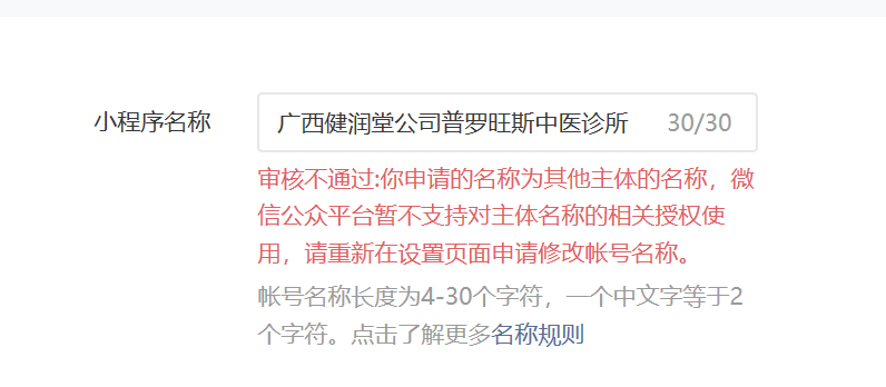 - 需求的场景描述(希望解决的问题)小程序名称审核不通过,请问我所申请的名称为什么是其他主体的名称?我诊所的名称太长,这个小程序名称只能十五个字,又不能填完,简略又不通过,请问我小程序名称要如何取?我所提供的材料哪里不能体现我小程序的所有权!