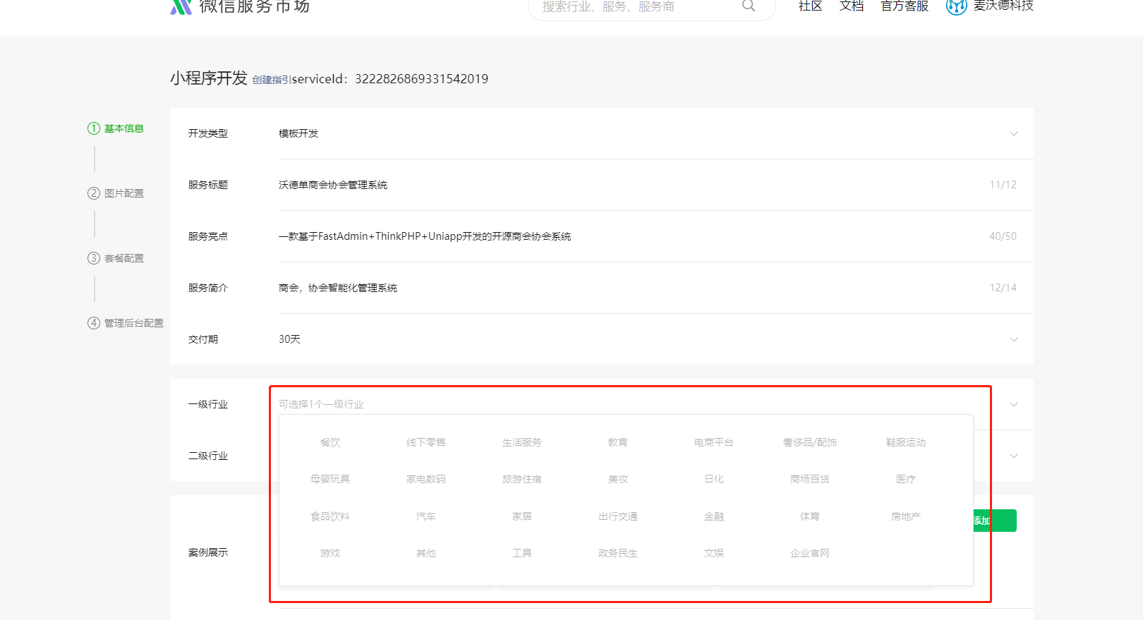 官方你好,我们公司有一款研发软件,想进行销售,但是入驻微信服务市场,选择模板开发,无法选择行业,请告知什么原因