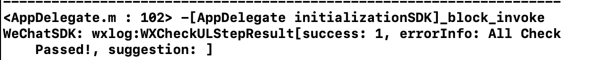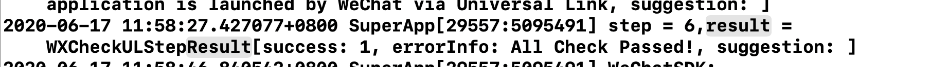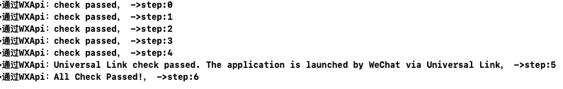 2020-12-07 18:08:14.613846+0800 xxxxxx[1837:525826] WeChatSDK: wxlog:WXCheckULStepResult[success: 1, errorInfo: Universal Link check passed. The application is launched by WeChat via Universal Link, suggestion: ]