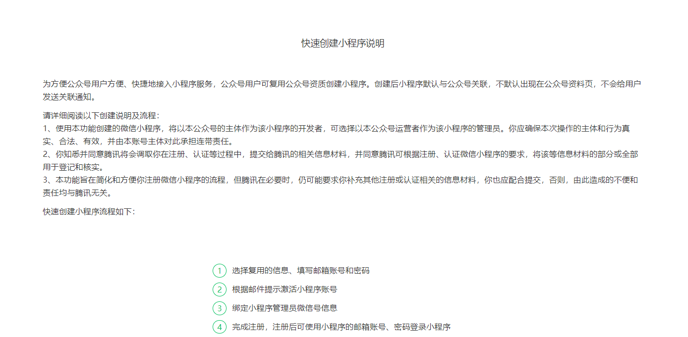 我遇到的更离谱,我输入新邮箱注册,前面一切正常,等到邮箱验证的时候,点击邮箱的链接,直接提示链接失效,重新注册。退出来,再点击链接,就提示小程序已激活,直接用账号密码登录。但是公众号里面显示小程序注册失败,也没有原因。我都怀疑是不是微信不提供公众号直接创建小程序的功能了