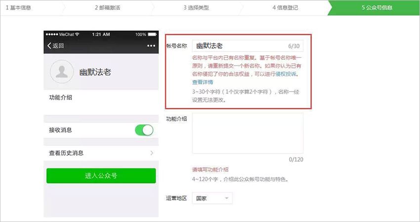 公众平台包括多个设置名称的流程:注册、认证、昵称清空等。为保障帐号申请的名称在流程过程中不被其他用户占用,会提前锁定申请流程中的名称。