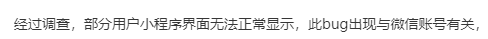 经过调查,部分用户小程序界面无法正常显示,此bug出现与微信账号有关,同一个微信账号不同设备都会有这个bug,换一个微信账号就没有了。