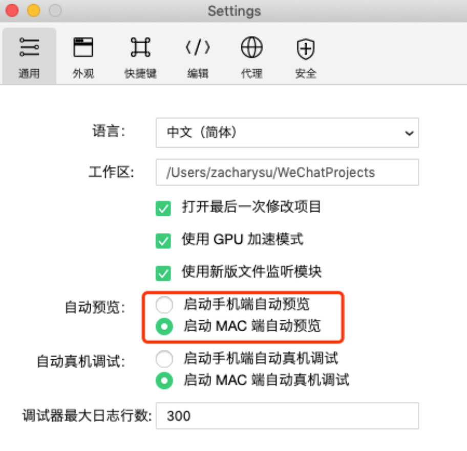 微信开发者工具菜单栏点击 设置->通用设置,在自动预览部分勾选“启动 MAC 端真机调试”。