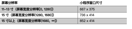 同时,Mac小程序还会根据屏幕的大小自动选择默认的窗口大小。提供的窗口大小从小到大依次为:
