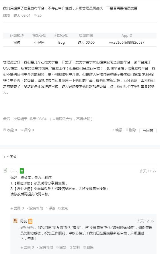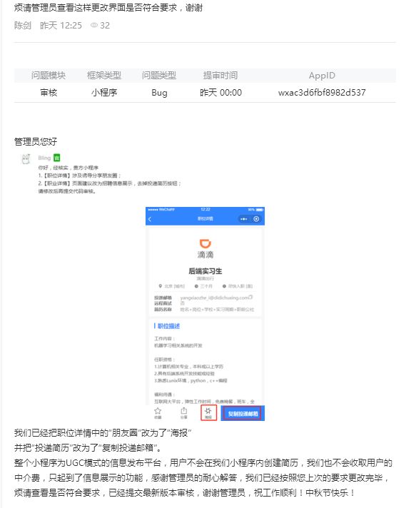 管理员您好,我们之前已经在论坛里说明过我们的情况,我们不提供中介服务,只是一个信息发布查询平台,管理员也确认过,并给出了修改意见,我们按照意见修改完以后,(将“朋友圈”改为“海报”,将“投递简历”改为“复制投递邮箱”),再次上论坛向管理员求证是否修改无误,管理员也回复说该版本没有问题,让我们再提交一次,但是提交审核后还是被卡住了,请问这是怎么回事呢?我们并不是中介机构,并且也按照管理员的意见修改并核实无误,为什么还要在审核上难为我们呢?