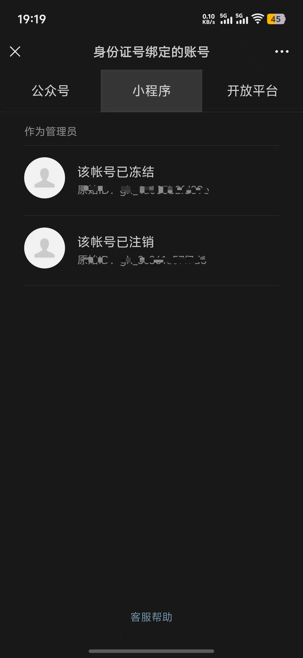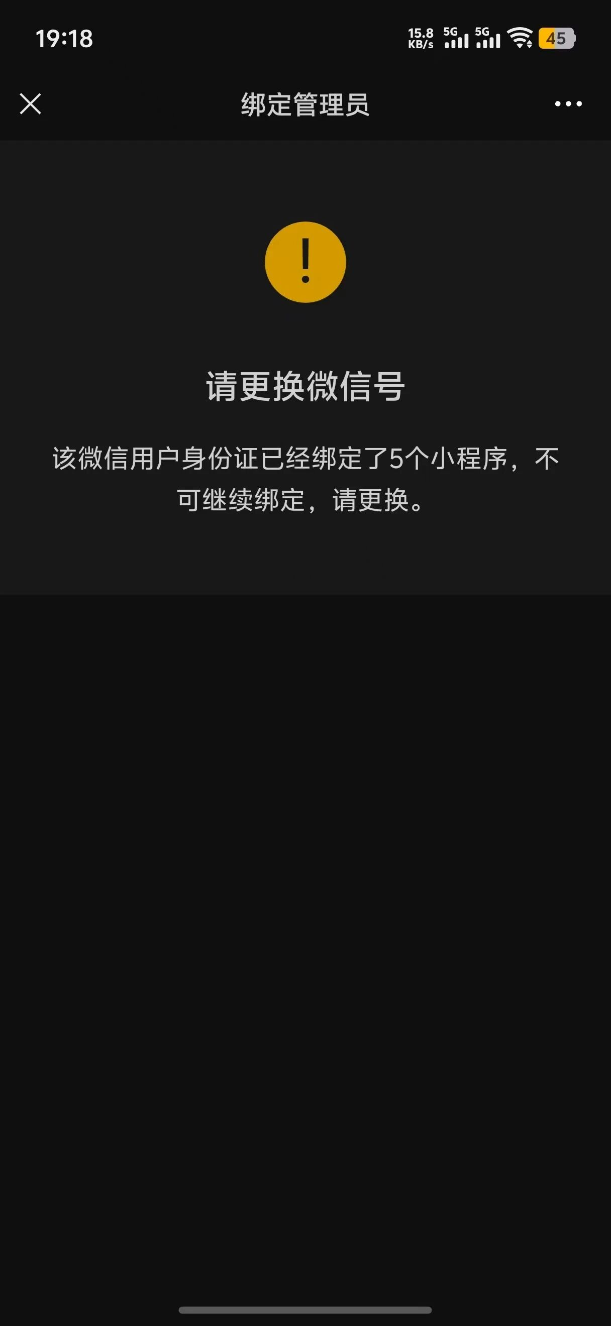 在公众平台助手上,根据我的身份证查询才绑定了2小程序,公司让绑定新的小程序管理员,提示我身份证已经绑定了5个。