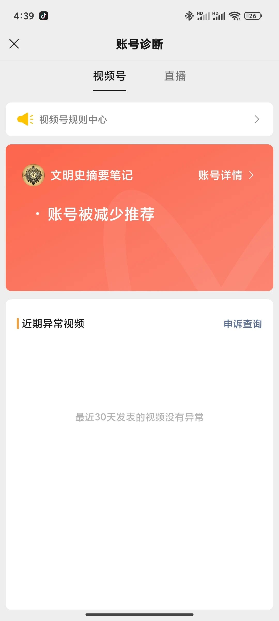 我刚注册视频号没几天,期间发布了一些历史类的视频,开始流量稳定,当有一条爆了后突然就没流量了,检测账号现实不符合账号质量,没有说是哪条视频有问题,申诉了也未通过,现在我也不知道问题在哪里?哎!最后全删了。问题也没找到。