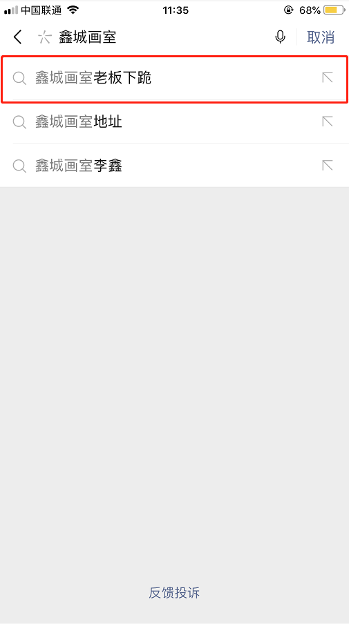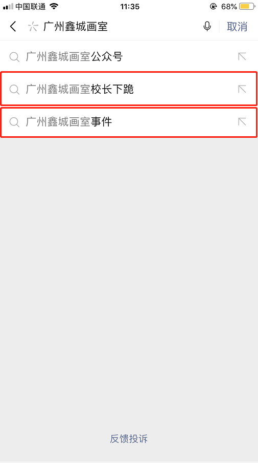 在搜一搜里搜索“鑫城画室、广州鑫城画室”时出现:鑫城画室老板下跪、广州鑫城画室老板下跪、广州鑫城画室事件