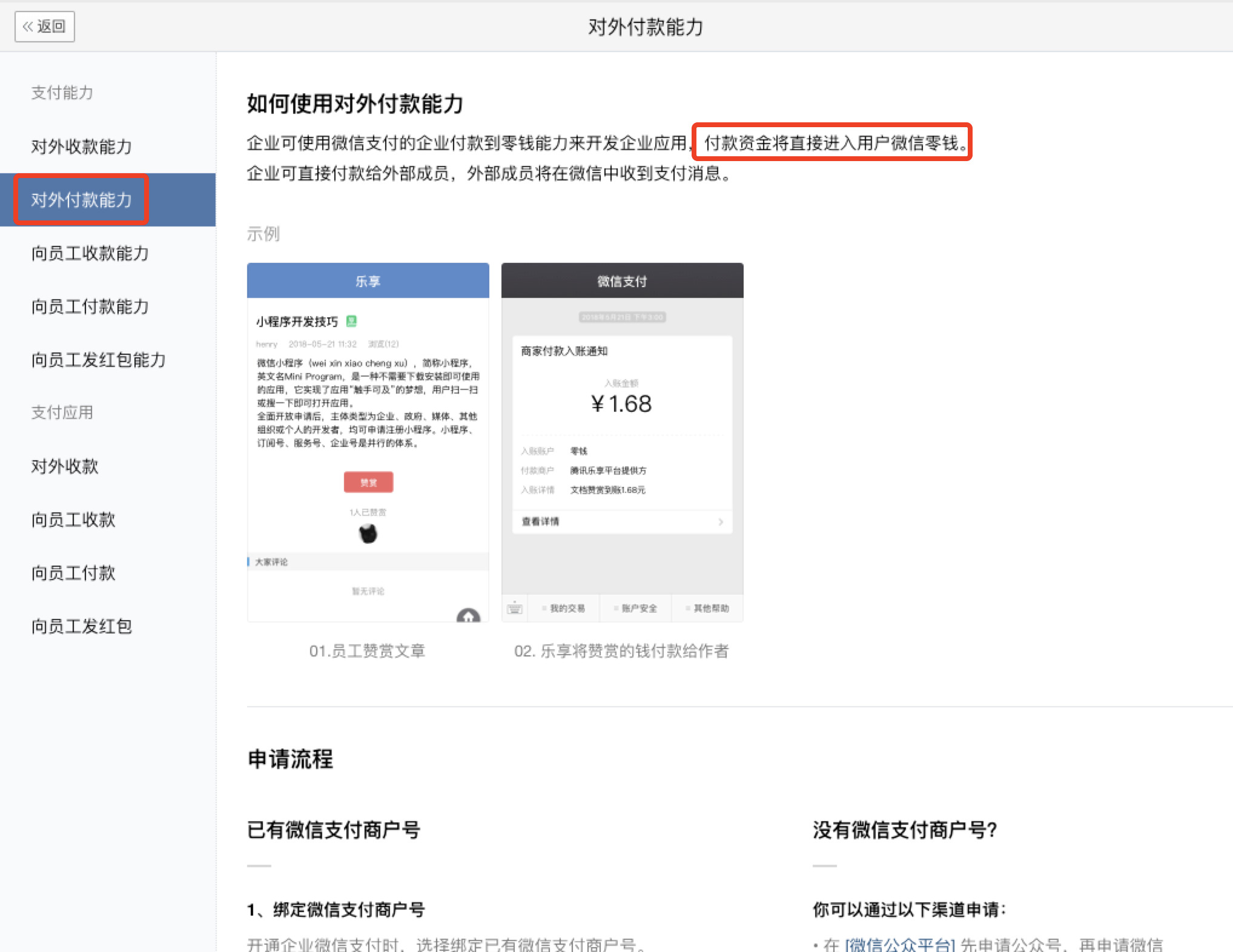您好,https://work.weixin.qq.com/api/doc#90000/90135/90275企业微信支付文档里面的发放企业红包及像员工付款接口即对外支付的接口,发放给外部成员只要能够拿到id就可以,这里付款方就是商户,要填商户id,收款方是微信用户,要填openid
