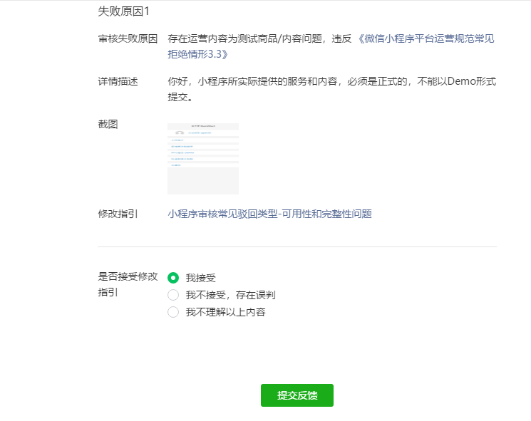 从官方给你的截图来看,你小程序是个DEMO,你开发了啥?不通过很正常。