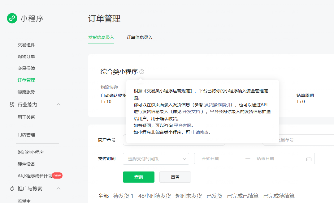 若非实物电商类小程序,请登录小程管理后台(https://mp.weixin.qq.com/)>支付与交易>订单管理->发货信息录入->小程序交易类型旁边的问号->点击申请修改,提交修改交易类型。修改交易类型为服务类小程序无需上传发货信息,订单会在交易后自动结算。若还有其他疑问商家可在该路径进行咨询下哈,路径:小程序管理后台https://mp.weixin.qq.com/ 支付与交易-订单管理-发货信息录入/订单信息录入-【实物电商类小程序】旁边的问号-平台客服咨询。