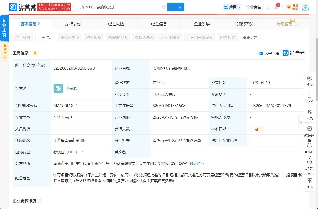 公司名称:崇川区张子昂的水果店
