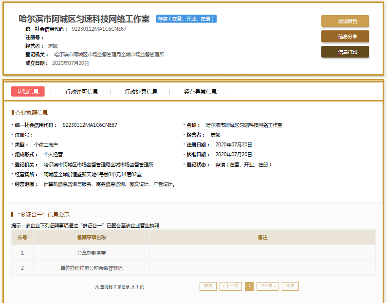 主体名称:哈尔滨市阿城区匀速科技网络工作室