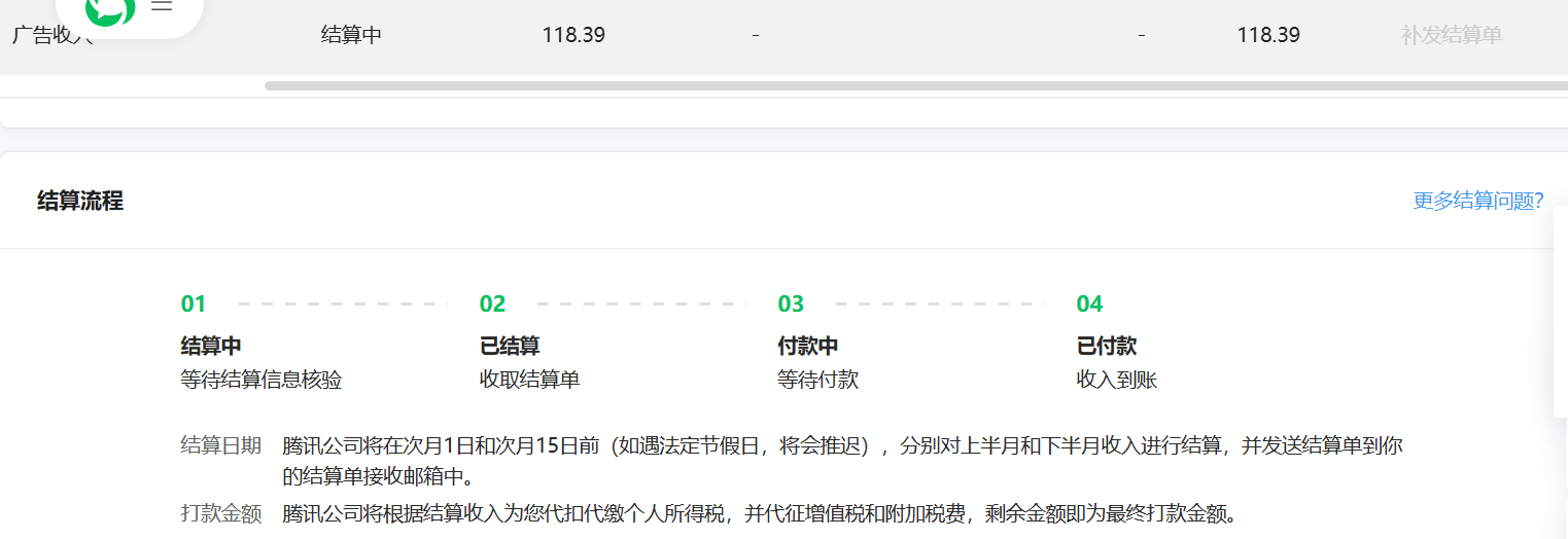 另外,2026年起已取消流量主最低提现门槛,这笔118.39元的收益已满足结算条件,不存在金额未达标无法结算的情况。关于「补发结算清单」不可点击,我了解到通常是对应结算单尚未生成,需等状态变为「已结算」才可操作,但目前长期停留在「结算中」,无法判断后续流程进度。