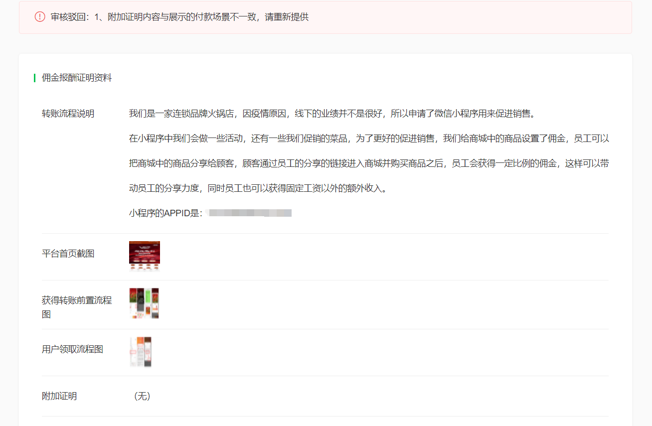 商户号:xxxxxxxxx 商户全称:xxxxxxx 场景模版:1005 佣金报酬 审核状态:审核驳回 1、附加证明内容与展示的付款场景不一致,请重新提供