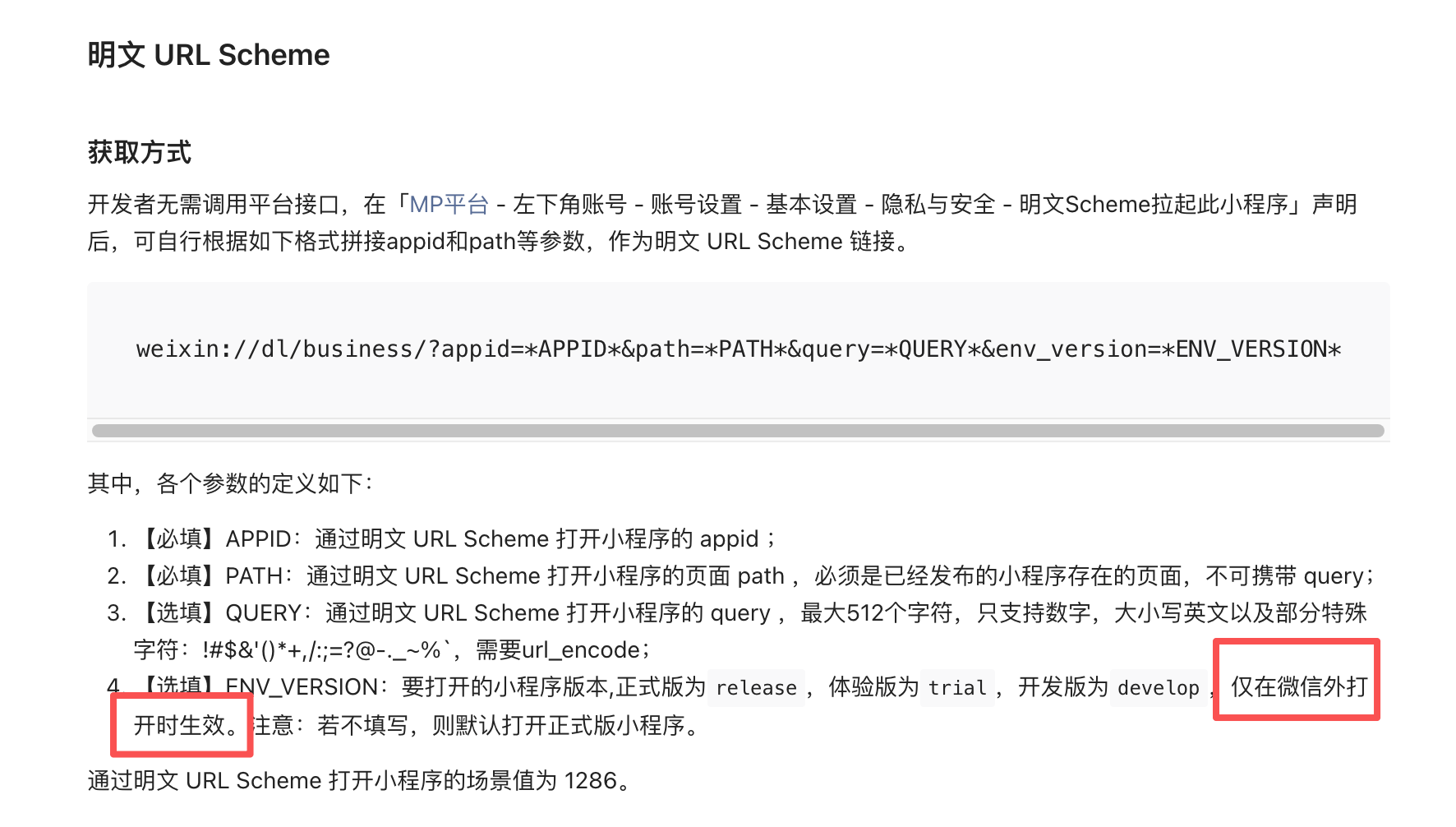 目前生成 env_version 为 develop 或 trial 的小程序链接需要在微信外打开才会跳转到开发版或者体验版,在微信内置浏览器打开只能跳转到正式版。